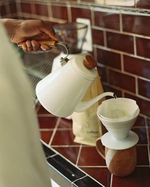 Whatever it is, we were thrilled when we found this kettle. It has all the components required for making great pour overs, with an aesthetic we find simple and warm.